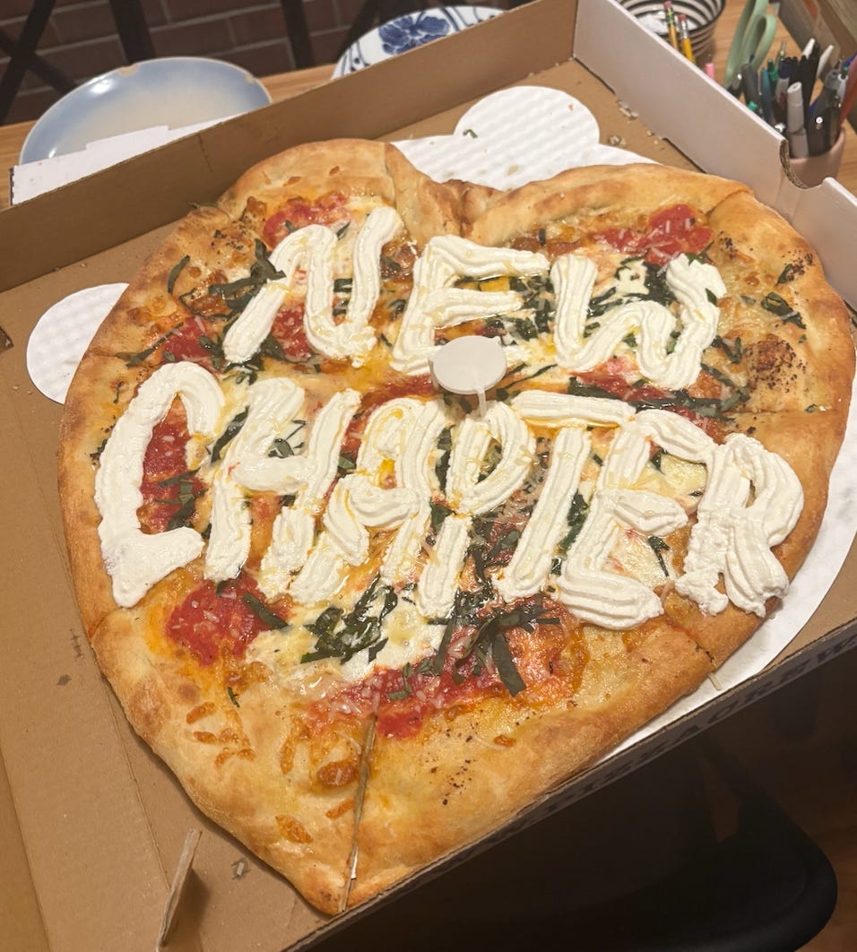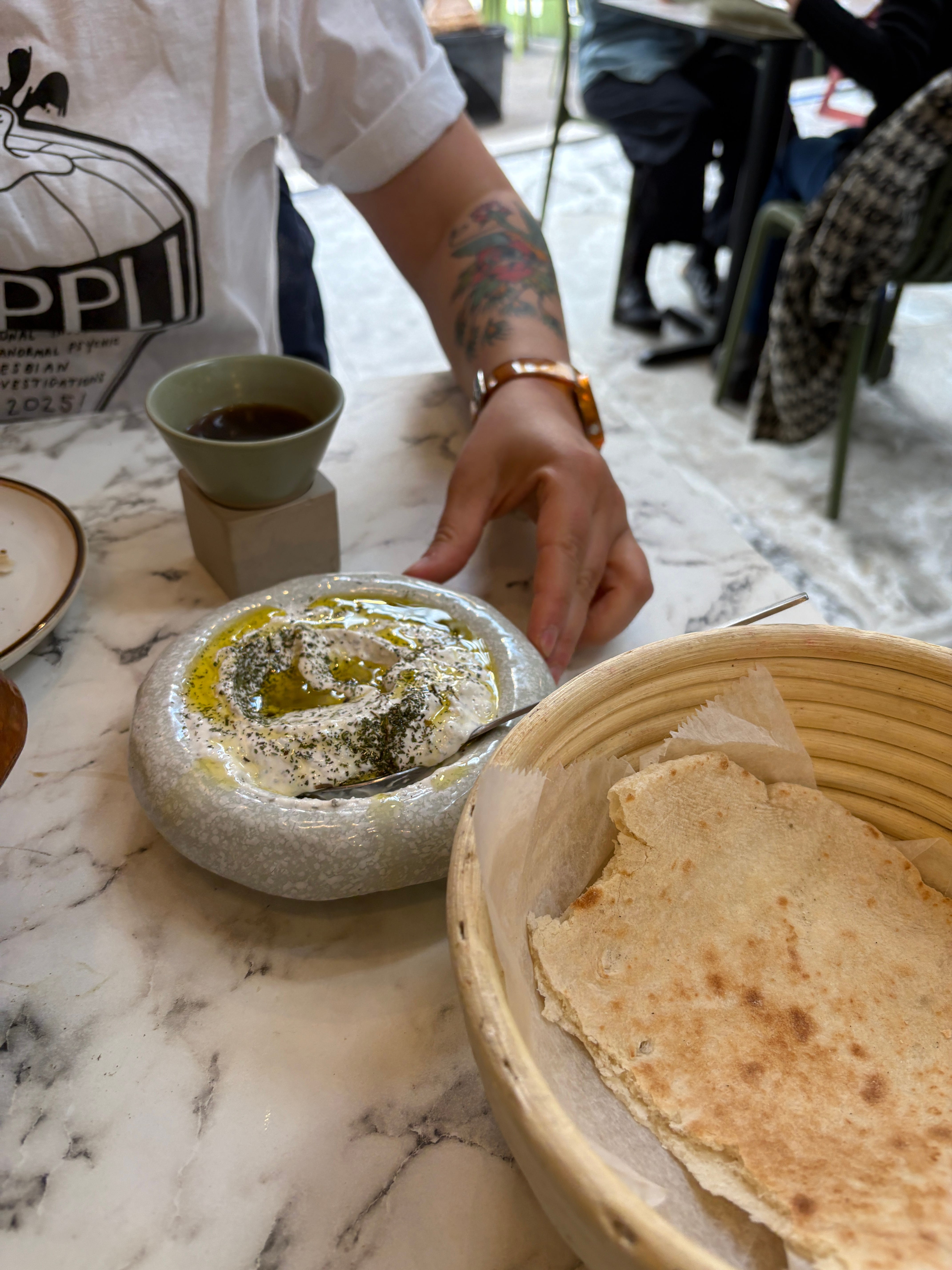 generously sent Williamsburg Pizza. She customized one of the pies to say a New Chapter, which was the perfect touch! I set out an assortment of chili flakes from Burlap and Barrel, hot honey, and chili crisp salad sprinkles (thank you, Delaney).I ran a cat related errand in Flatbush and headed to Ditmas Park after for lunch with Coop at Ayat, which was delicious. You’re greeted with warm bread, olive oil, and za’atar. We shared everything including some of the best labneh I’ve ever had, studded with herbs and drizzled with oil, an eggplant and halloumi platter, and cardamom spiced coffee. It was so special to catch up over such a feast and they have a bunch of locations, so go visit.