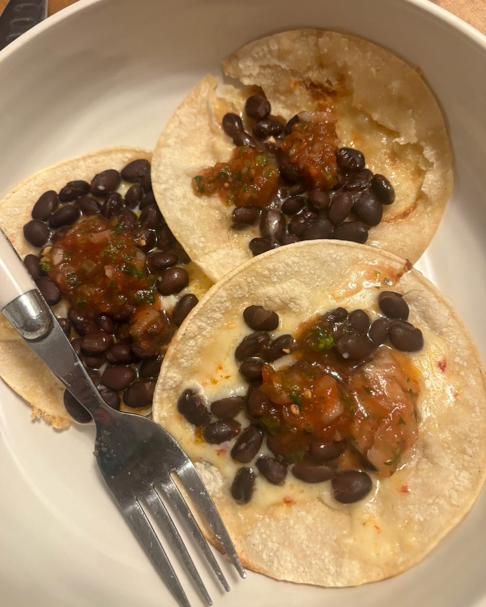 I dug some tortillas out of the depths of my freezer and made some black bean tacos with pepper jack cheese and lots of salsa. Simple combinations of beans and cheese work every time. The next day, I made the same thing but with scrambled eggs for breakfast.