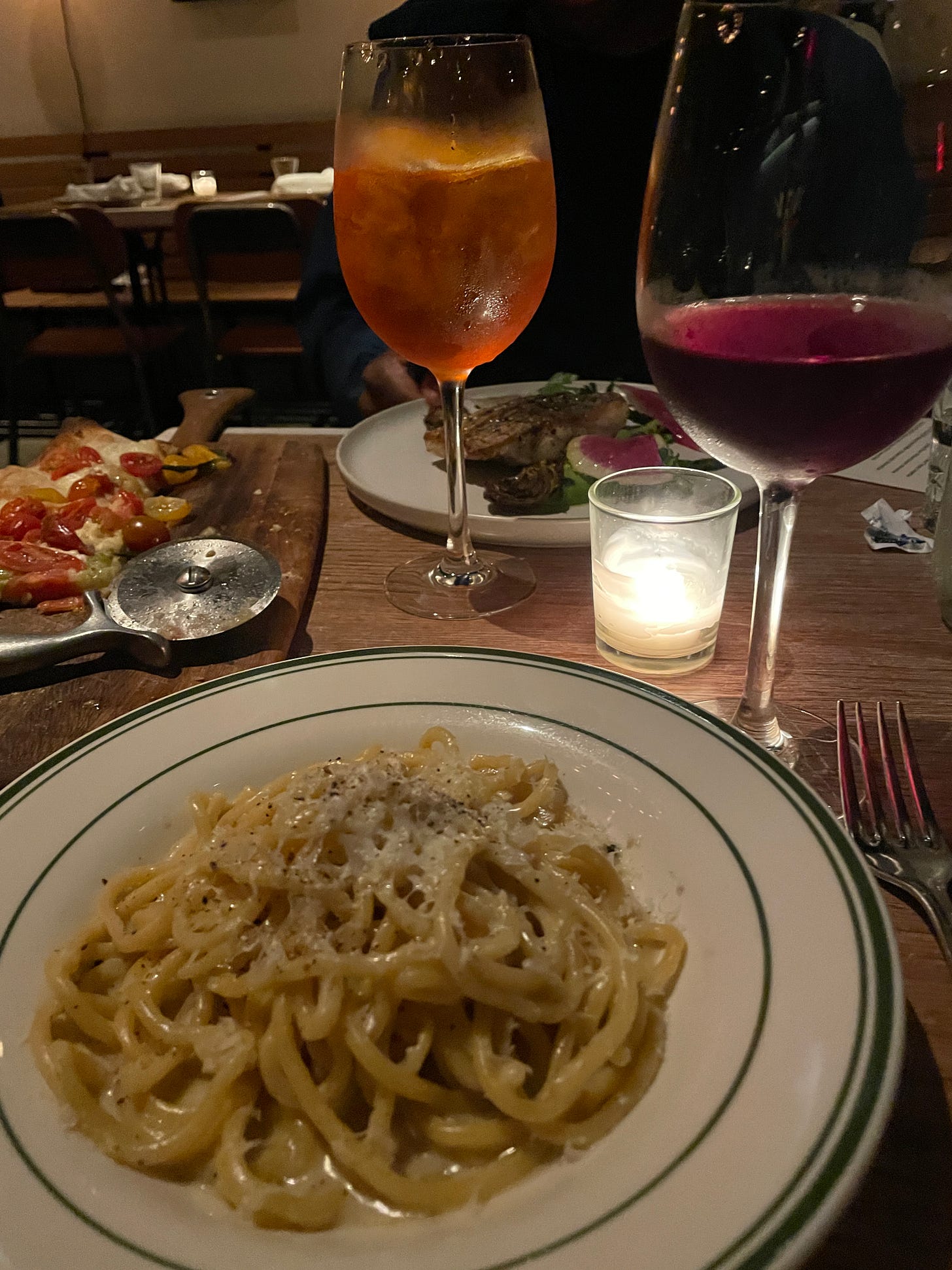 When Dale started at his job in 2019, we had cacio e pepe to celebrate. We continued the tradition for me at Montesacro, where we had cacio e pepe and aperol spritzes.