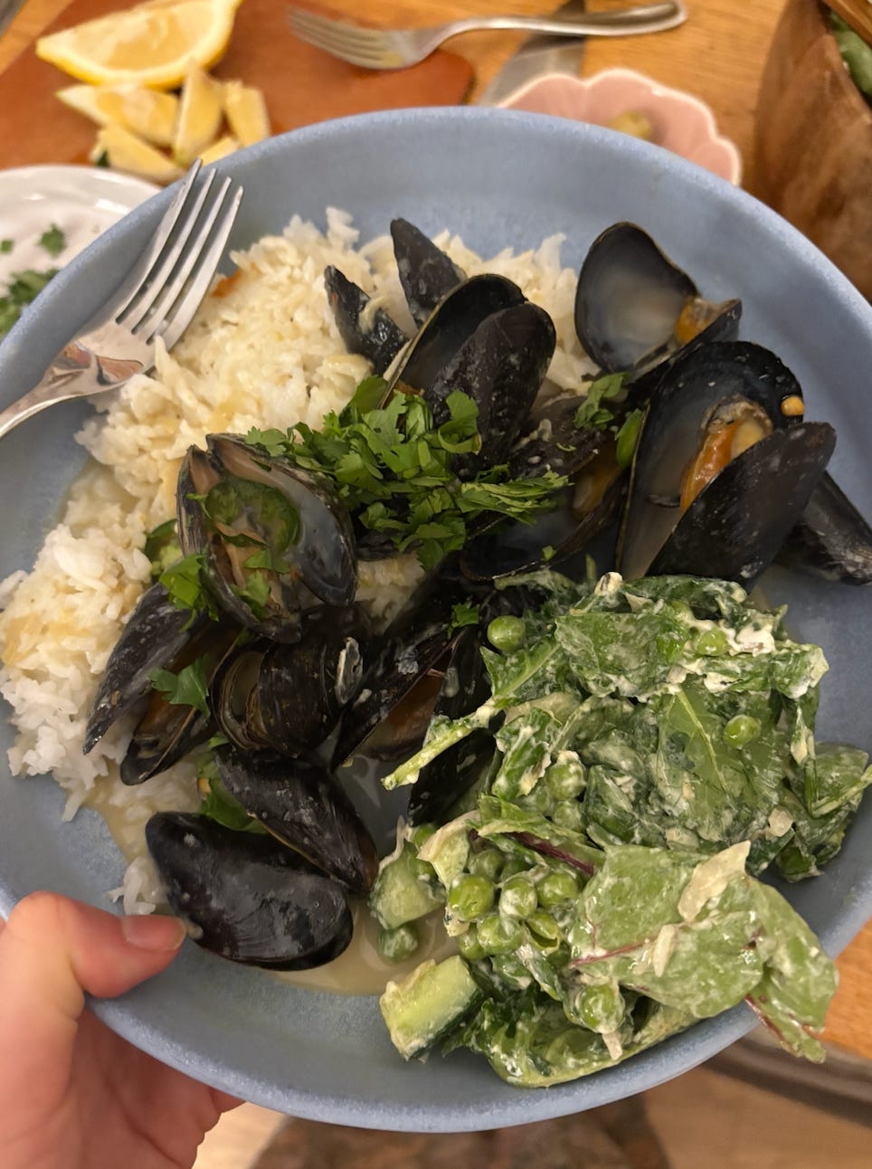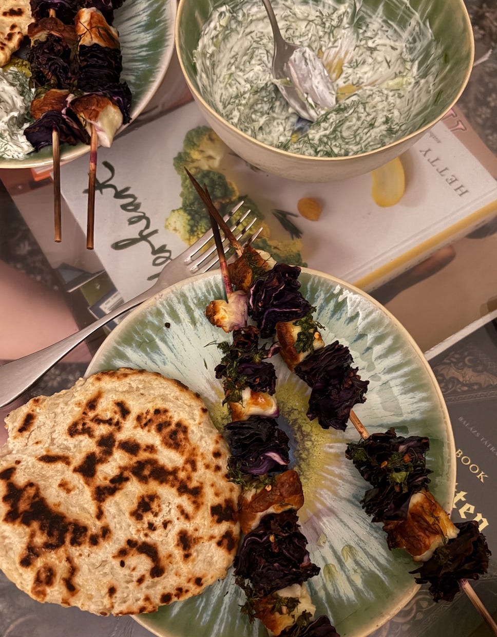 halloumi and cabbage skewers (mostly she made them) in the oven. They got a lovely color and char thanks to the broiler. To round out the meal, I made us yogurt flatbreads from the ebook Erica and I wrote in 2022. They’re so simple and easy, even without a rolling pin (we used a wine bottle). We also made a little tzatziki sauce and we didn’t blend the herb/caper/lemon mixture because why make more dishes. It was a delicious meal, especially for this time of year.James and Julia hosted a fantastic oyster night featuring freshly shucked oysters and green curry mussels. Julia made key lime pie for dessert, which felt on theme. I made a pumpkin banana bread for them to eat the next day for breakfast (recipe from Serena Wolf’s cookbook) and it was fun to bake with pumpkin for the first time this season.