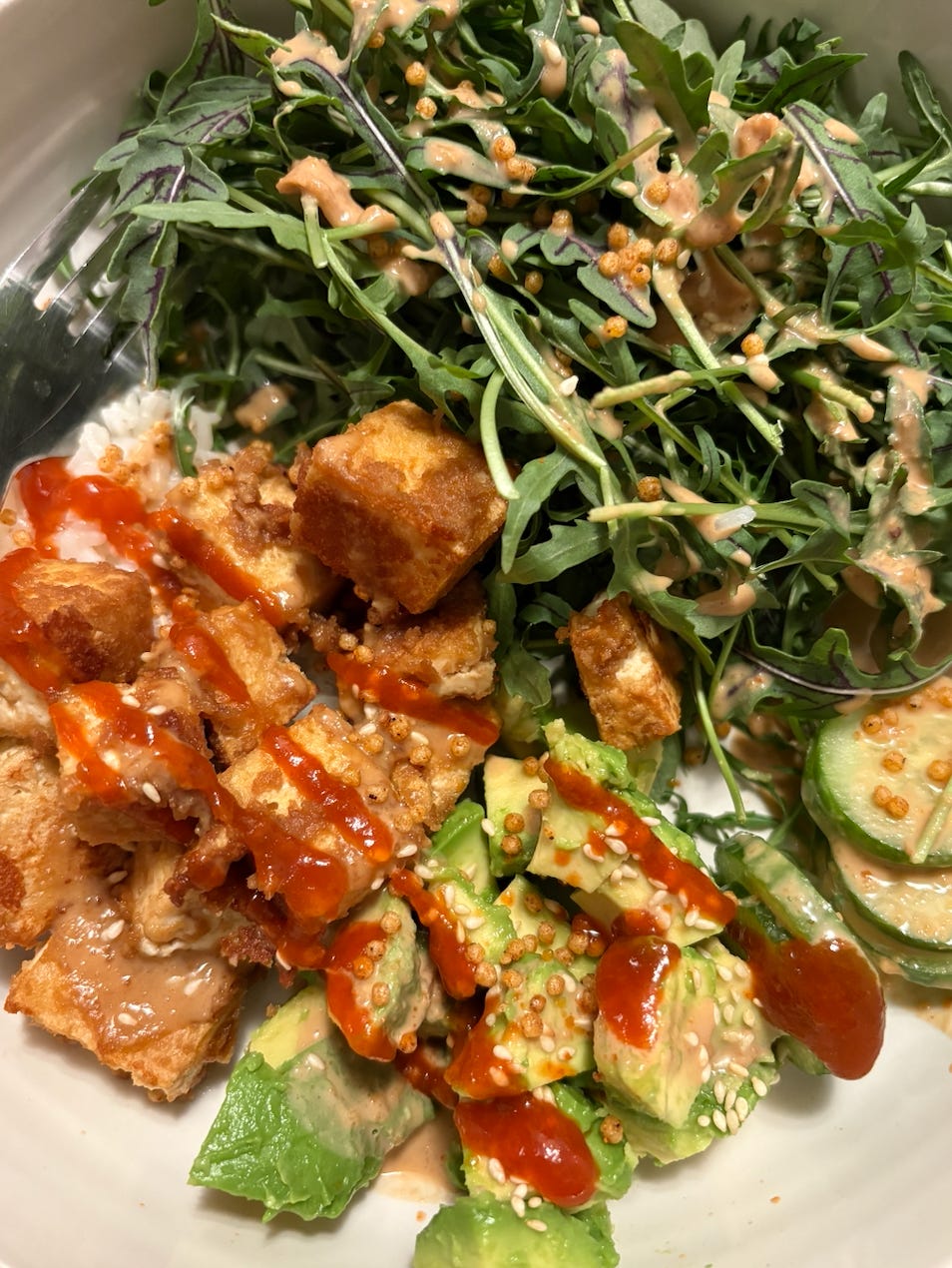On Friday, I made tofu rice bowls with Jared featuring a no recipe peanut sauce, cucumbers, and a ripe avocado (always a miracle). Tofuture sent me a tofu press, which I’ve long been curious about, and it worked really well, even with just 20 minutes of pressing. I want to try putting the tofu to press in the morning and cooking it after I get home but as the flyer that came with it says, “Remember, if you have only have 10 minutes pressing time, that is better than no time at all!”